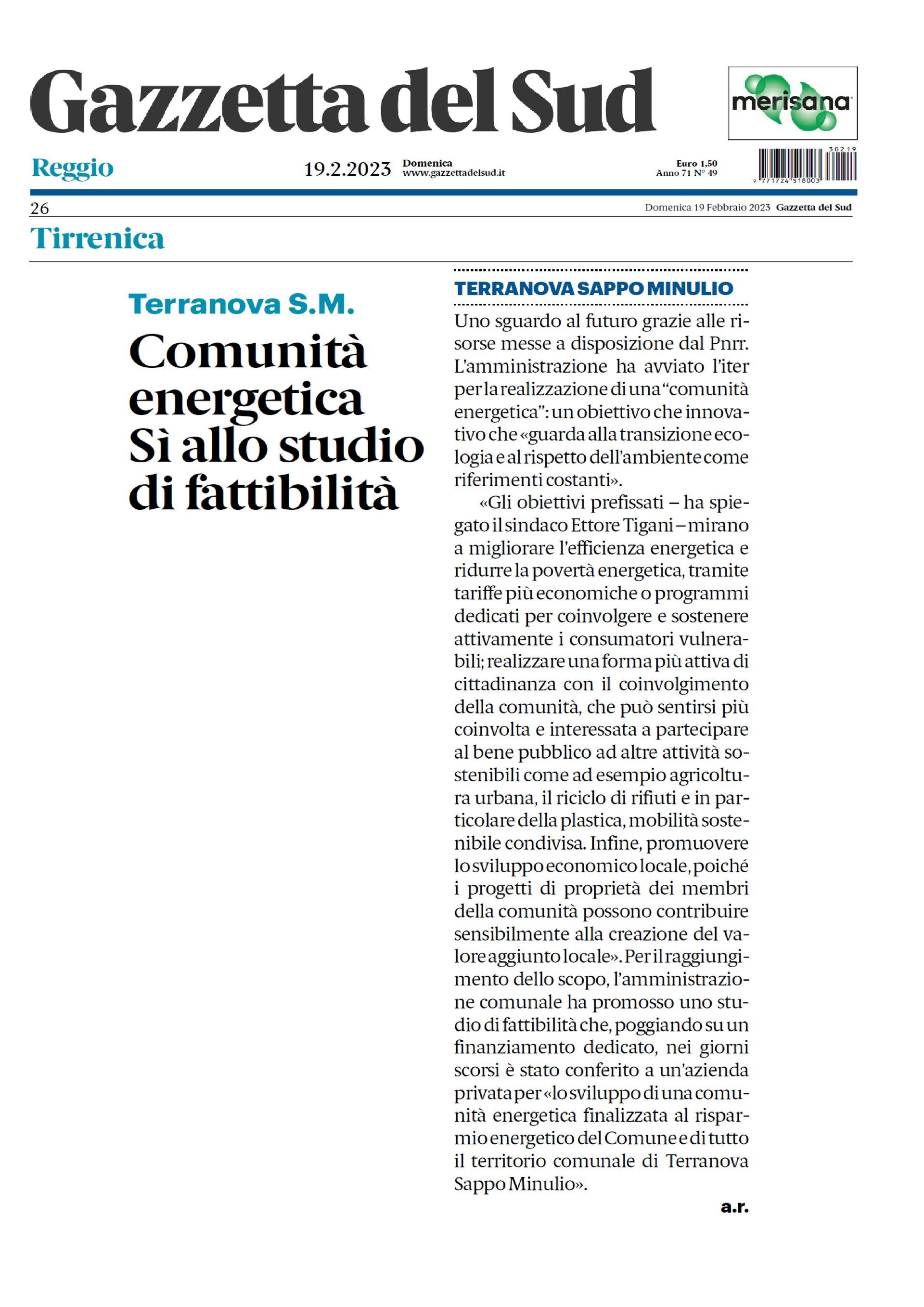 Il sindaco Tigani precisa che per il il “raggiungimento di tali obiettivi, l’Amministrazione Comunale di Terranova ha promosso uno studio di fattibilità e, potendo sfruttare un finanziamento dedicato a tale obiettivo” e che nei giorni scorsi a fare tale studio è stata incaricata una società cosentina (con determina n. 5 del 16 febbraio 2023), appunto per studiare oltre alla fattibilità tecnica anche quella “economica per lo sviluppo di una comunità energetica finalizzata al risparmio energetico del comune e di tutto il territorio comunale di Terranova Sappo Minulio”.
